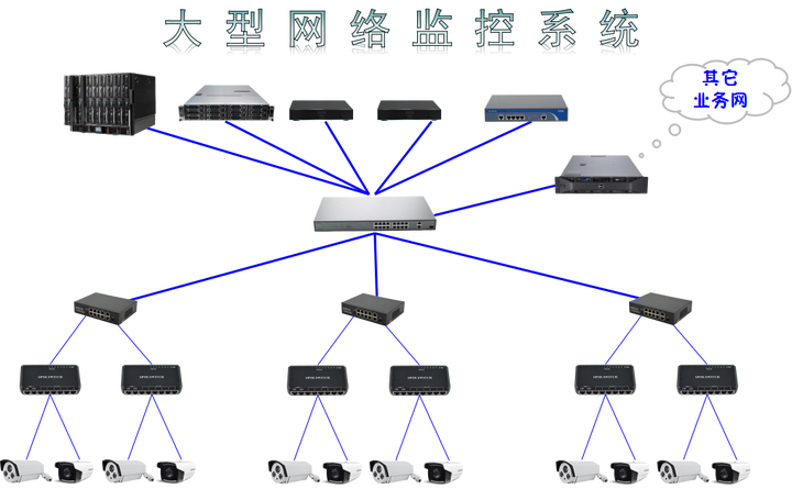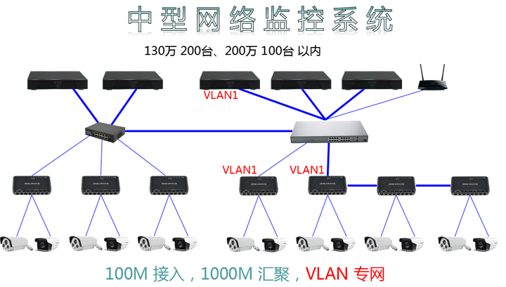 (2)汇聚层则用多千兆上联口或全千兆的智能型交换机,千兆口接NVR,可保障25路-32路大型录像机的汇入带宽。