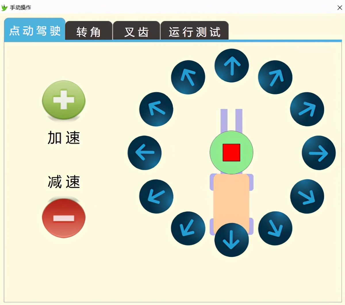 按照显示的货叉和AGV车头方向,点击对应按钮,即可向对应方向前进或则后退,点击中间按钮停车,点击+-可加速/减速。